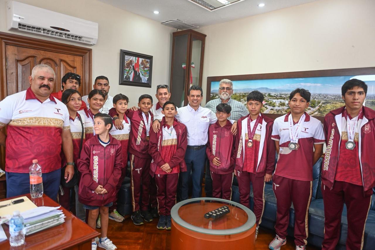 “Con su constancia, perseverancia y esfuerzo han puesto a Victoria, la Capital de Tamaulipas, en lo más alto del deporte nacional, son un orgullo para nuestra ciudad”, expresó Gattás Báez al recibir en su despacho al grupo de atletas, entrenadores y padres de familia.