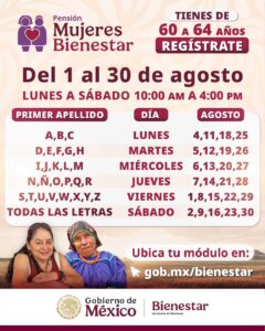 Ciudad Victoria, Tamaulipas.- A partir del próximo 1 de agosto, mujeres de entre 60 y 64 años podrán registrarse en el programa federal Pensión Mujeres Bienestar, una iniciativa que busca apoyar económicamente a este sector de la población.