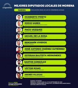 En la lista, entre los diez diputados locales mejor calificados, con el tamaulipeco, se cuentan cinco Presidentes de los órganos de gobierno legislativo, como tales, y otros cinco que se destacaron en el trabajo desarrollado respecto de sus distritos.