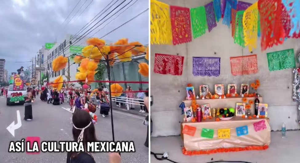 En las imágenes se observa un colorido desfile donde tanto japoneses como residentes mexicanos recorren las calles caracterizados como catrinas y calaveras, acompañados de música y bailes que mezclan lo mejor de ambas tradiciones.