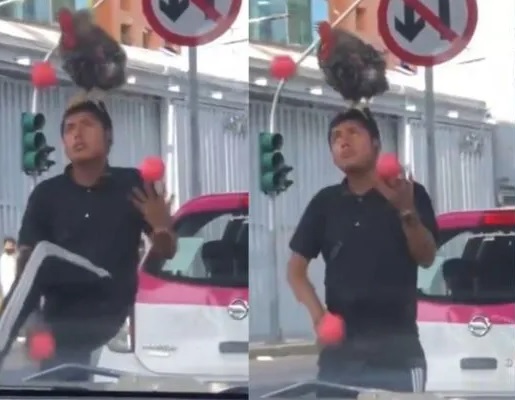 En la grabación se aprecia a un hombre realizando su rutina en medio de un cruce vehicular, aprovechando la pausa del semáforo.