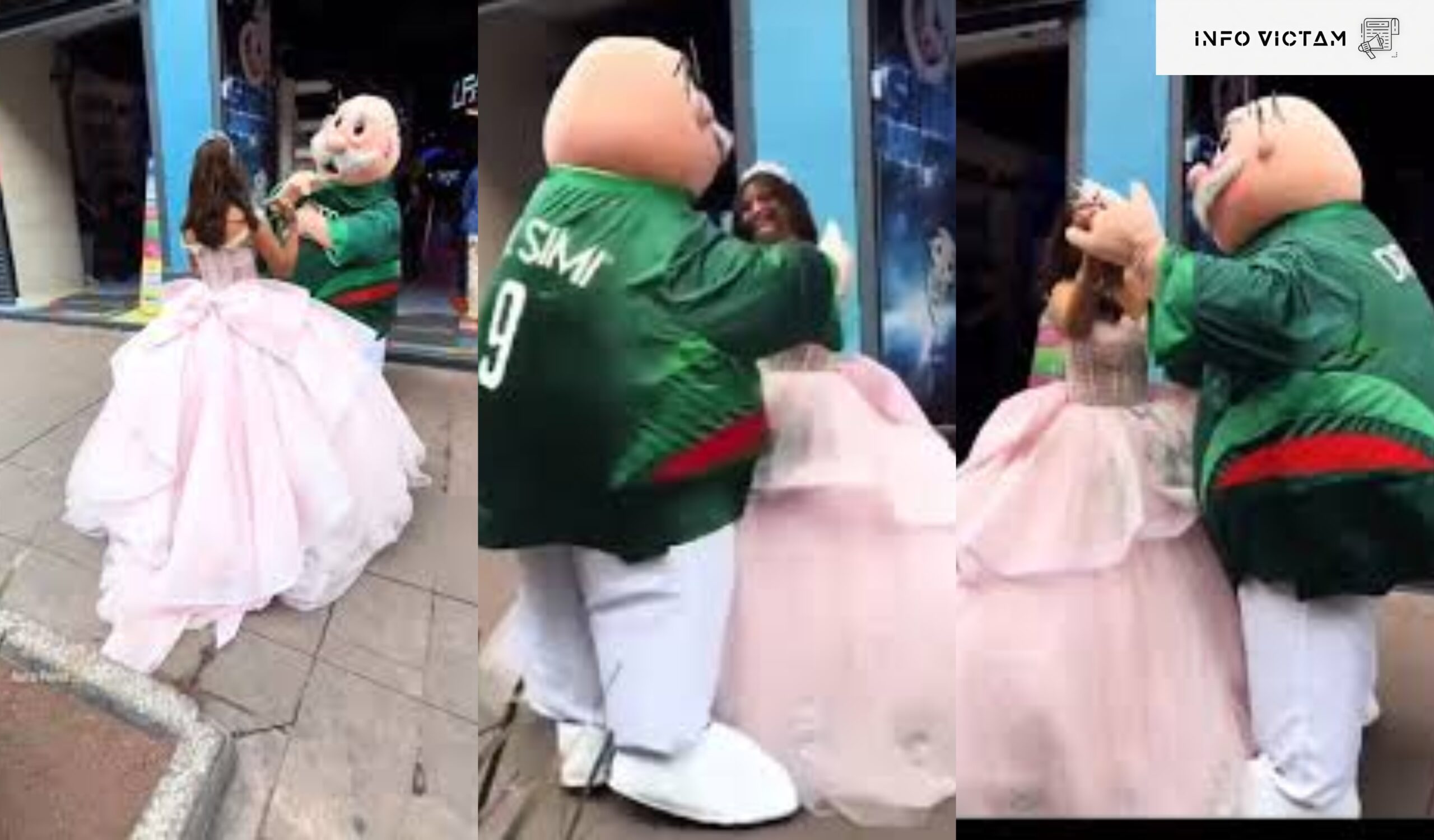 En las imágenes aparece el personaje conocido como Dr. Simi acompañando a una joven que festeja sus quince años. La adolescente, ataviada con un vestido característico de esta importante fecha, participa junto a la botarga en un vals improvisado frente a transeúntes que observan la escena.